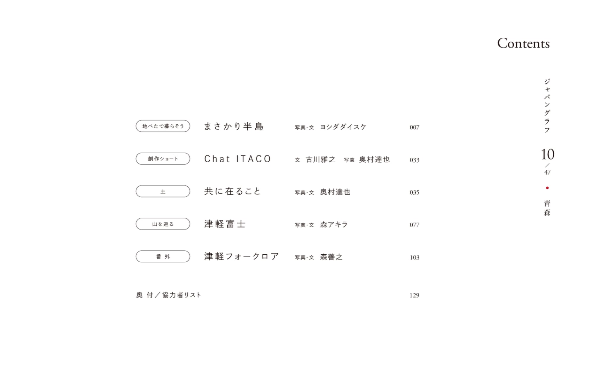 コンテンツを4つに絞り込み、それぞれのページを「今まで以上に写真で伝える」という意図に基づいて、4名の写真家がそれぞれの視点で捉えた青森を充分なページ数で構成する内容となっています。